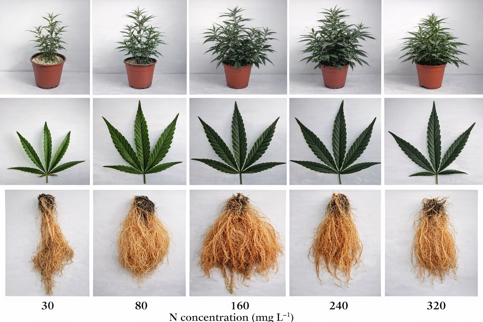This image shows how cannabis plants respond as nitrogen availability increases—from limited access to optimized nutrient use. As nutrients become more available, plant size, leaf structure, and root development visibly improve.